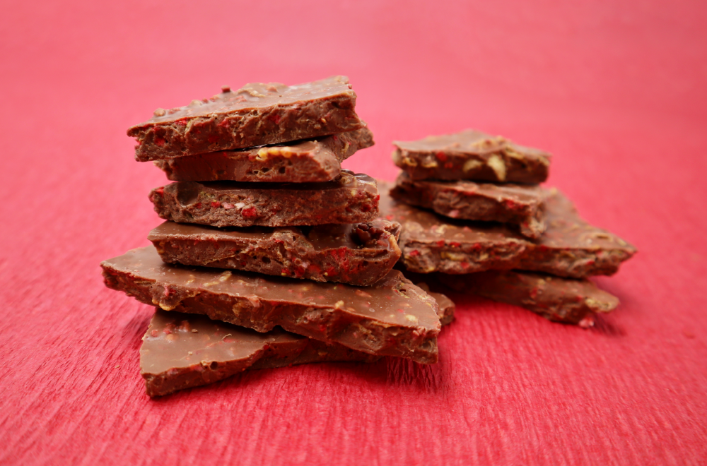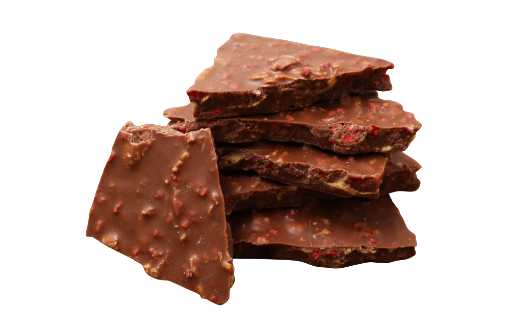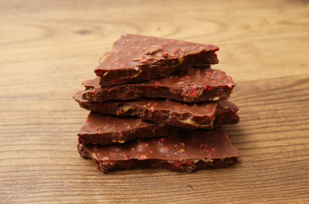 あま〜いチョコレートにいちごの酸味と、コーンフレークの香ばしさが楽しめる割れチョコ「純愛ストロベリー」